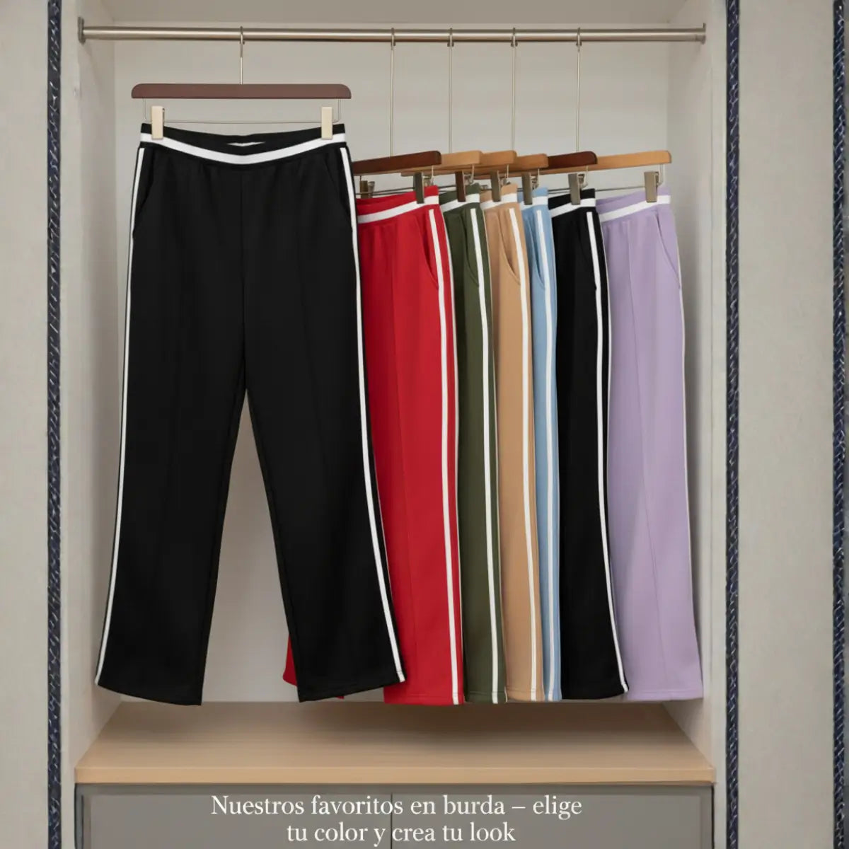 Descubre nuestros pantalones en burda premium con diseño moderno y líneas laterales que alargan visualmente tu silueta.